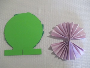 紙で土台を作ります。2枚の紙を糊付けします。それを2センチ幅で山折り、谷折りをしてアコーディオンのように折ります。真ん中を止めます。リースの土台の中央に切り込みをいれて折った紙の真ん中に差し込みます。折った土台の広げた両端と、リースの土台とをペーパークリップで止めます。