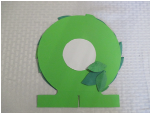 もし3回紙を切る時間を節約したければ、緑色の紙を厚紙の表裏に貼り付けます。それからリースと土台の形に切り取ります。こうすれば一度に3枚を切れますし、別々に切ったものをきちんと綺麗に貼り付けることに頭を悩ませることはありません。