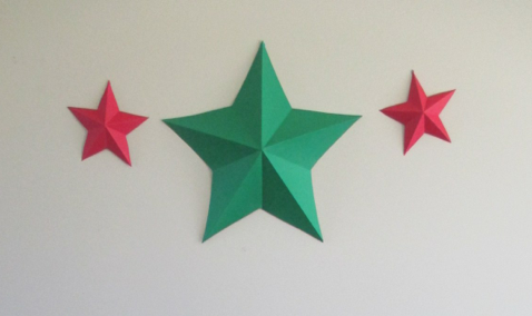 紙を折って星を作ります。紙を折りたたんで開くと貴方の星に会えますよ。緑の星のパターンを作るのに新聞紙を使いますが、星がインクで汚れないよう注意してください。星型に切った紙を山折りと谷折りにすれば3Dの星になります。星を壁に貼るには、ファンタックや取り付け器具を使います。